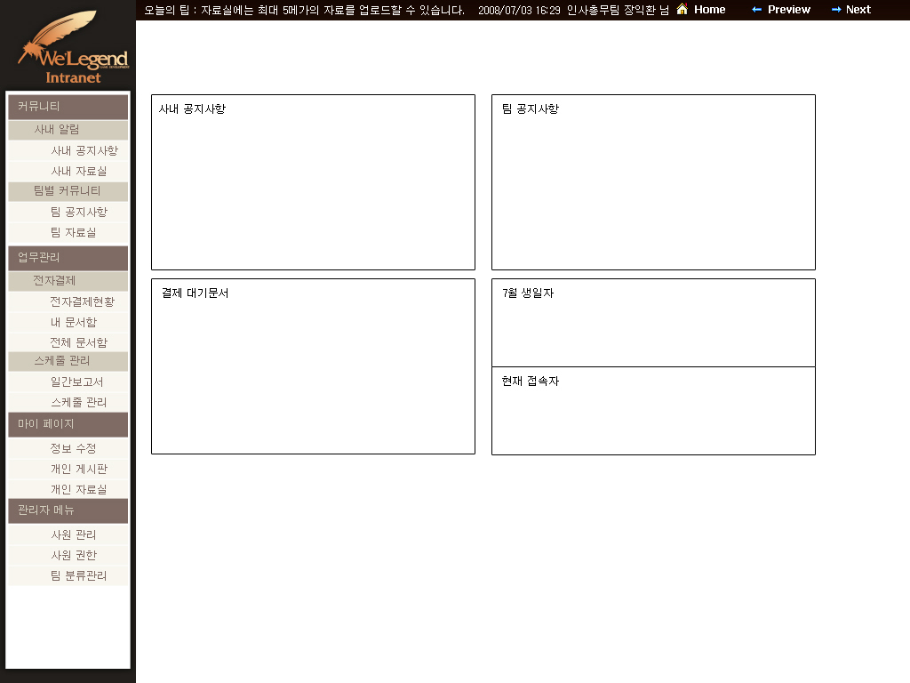 레이아웃을 구상하는 데 있어서 좀 힘들었던 것은 우선 인트라넷은 디자인보다 기능이 우선되어야 하기 때문에, 심플하고 보기 편하게 하는 목적을 이루기 위한 디자인 레이아웃이 큰 문제였다.