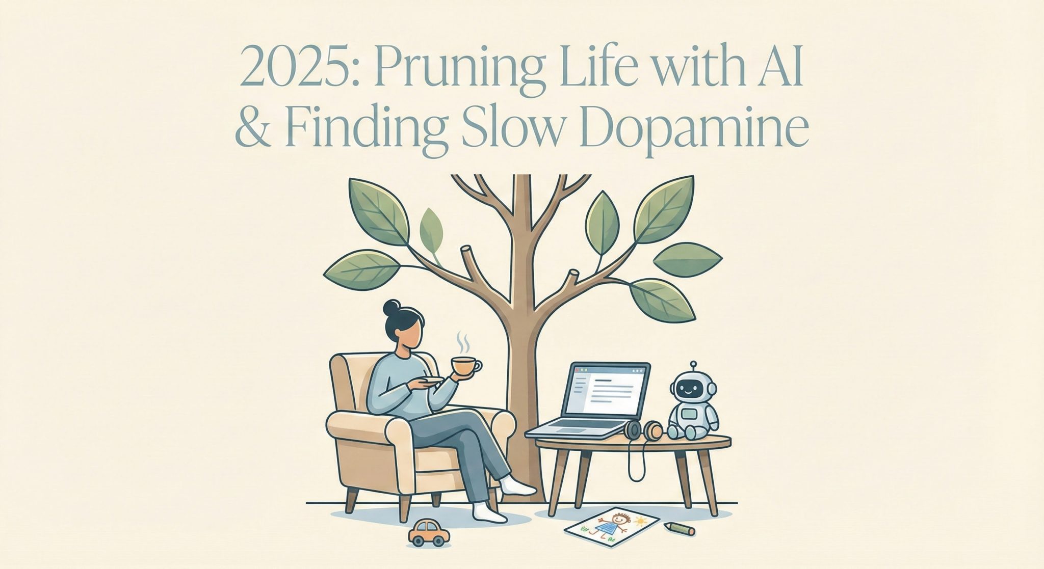 Tl;dr: AI로 삶을 가지치기하고 ‘진짜 나’를 되찾은 2025년 1. AI: 도구를 넘어 ‘사유의 파트너’로• 단순 검색이나 생성이 아니라, 내 커리어 고민과 내면의 목소리를 정리해 주는 ‘오래된 친구’ 같은 존재가 됨.• Antigravity 같은 도구에 실무를 위임(가지치기)함으로써, 하이레벨 설계와 가족에게 집중할 시간을 확보함. 2. 도파민의 변화: ‘생존’에서 ‘안정’으로• 오후 4시만 되면 술과 단것을 찾던 이유가 뇌의 에너지가 …