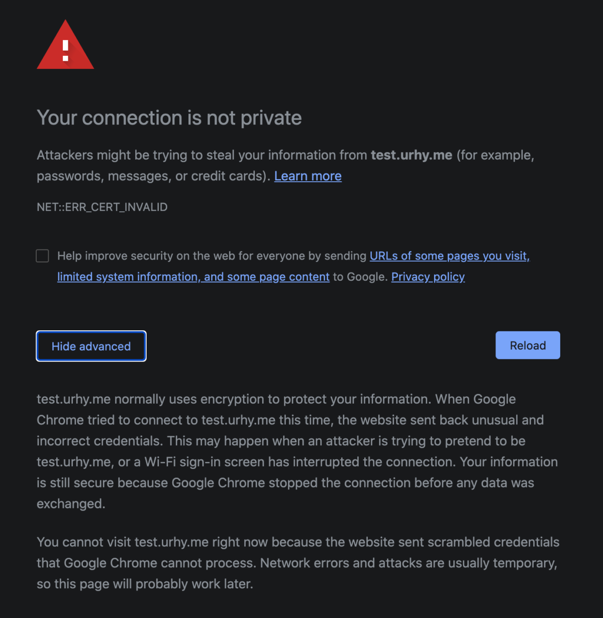 간혹 크롬에서 signed되지 않은 (self-signed등) SSL을 실행하면 아래와 같이 접속이 불가능할 때가 있다. 사실 인증서가 당연히 안전하지 않은 것이므로 이럴땐 올바른 테스트용 인증서로 작업하는게 정상적인 방법이지만, 매번 SSL 세팅하고 그러는게 여간 번거로운게 아닐때가 많다.